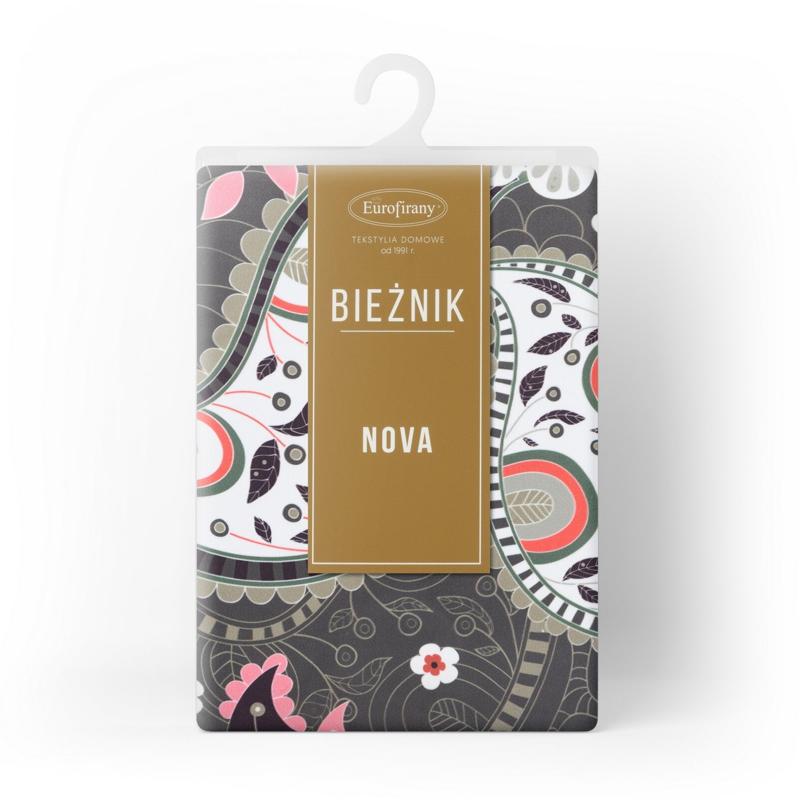 Elegants skrejceļš, kas izgatavots no mīksta un pieskārieniem patīkama samta auduma, rotāts ar krāšņu ziedu apdruku. Gludiniet kreisajā pusē. Platums: 35 cm, garums: 180 cm, krāsa: melna, svars: 260 GSM, sastāvs: Materiāls: 100% poliesteris.