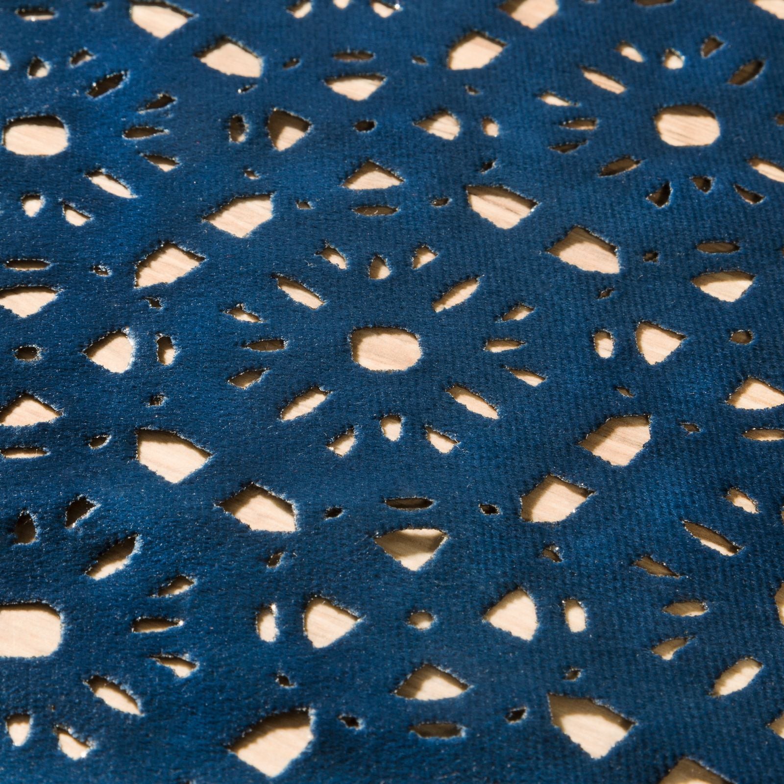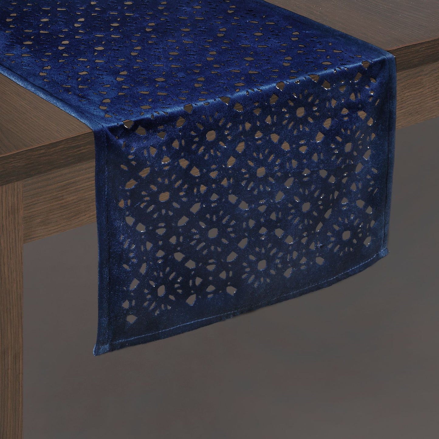 Ārkārtīgi izteiksmīgs samta pārklājums, kas izceļas ar lāzera griezumu veidotu ažūru rakstu, kas klāj visu virsmu. Plašums: 33 cm, garums: 180 cm, krāsa: tumši zila, svars: 200GSM GSM, sastāvs: Sastāvs: 100% poliesteris.