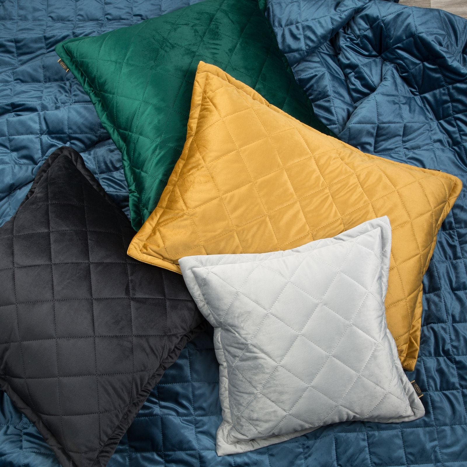 Elegants, plūksnots gultas pārklājs no augstas kvalitātes samta ar izteiktu spīdumu. Virsma ir stepēta ar tradicionālo stepēšanas metodi. Platums: 60 cm, garums: 60 cm, krāsa: tumši zila, svars: 220+70+220 GSM, sastāvs: Sastāvs: 100% poliesteris.