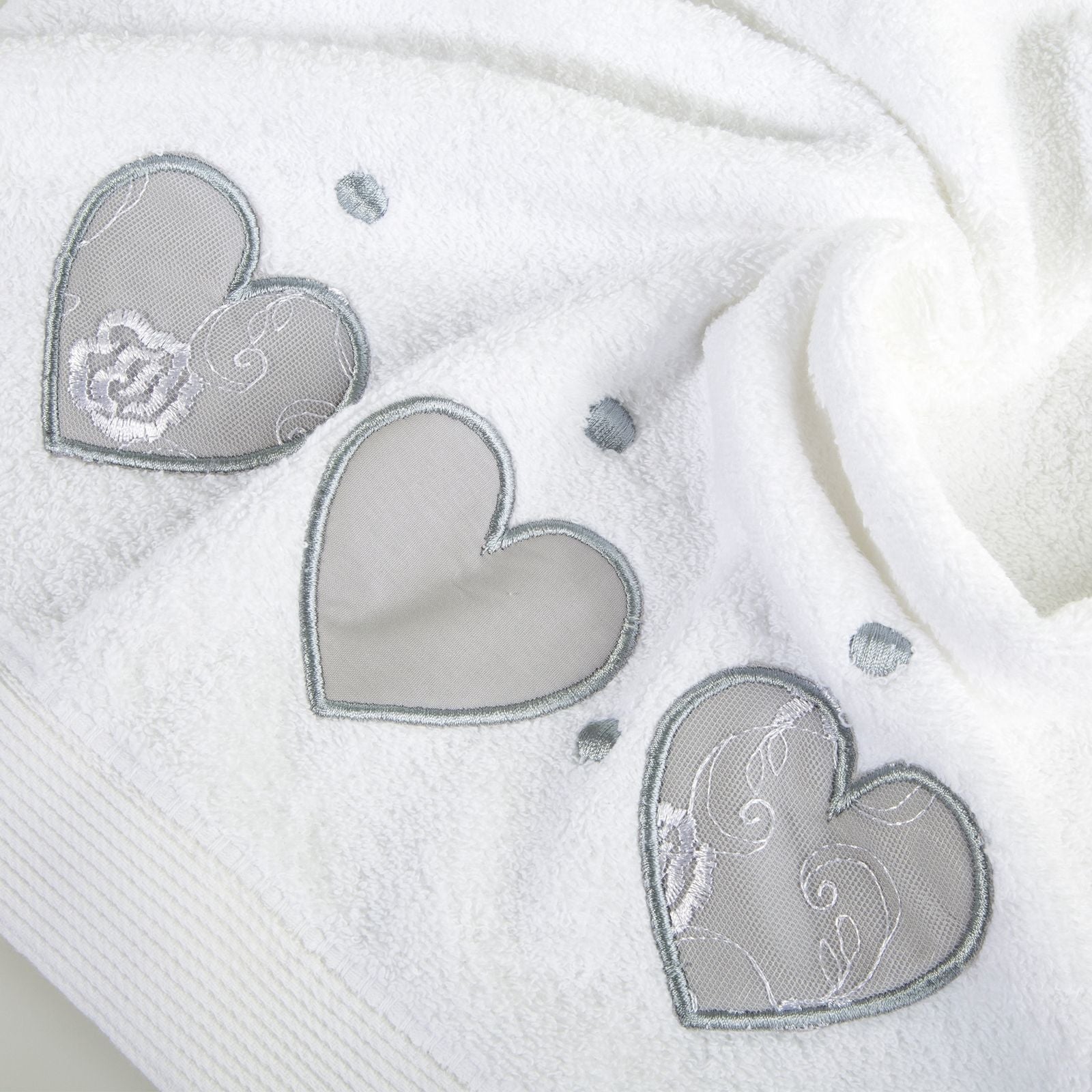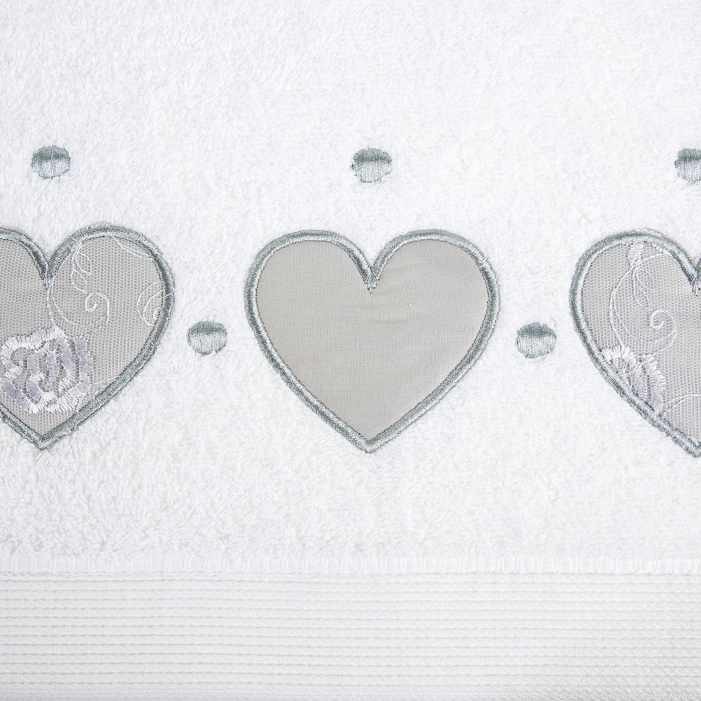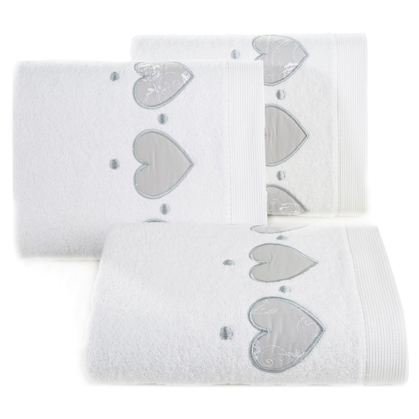 Mīksts vannas dvielis no smalkas kokvilnas, rotāts ar aplikācijām un izšuvumiem sirsniņu formā. Platums: 70 cm, garums: 140 cm, krāsa: balta, gramatūra: 500 GSM, sastāvs: Sastāvs: 100% kokvilna; 50% kokvilna, 50% poliesters.