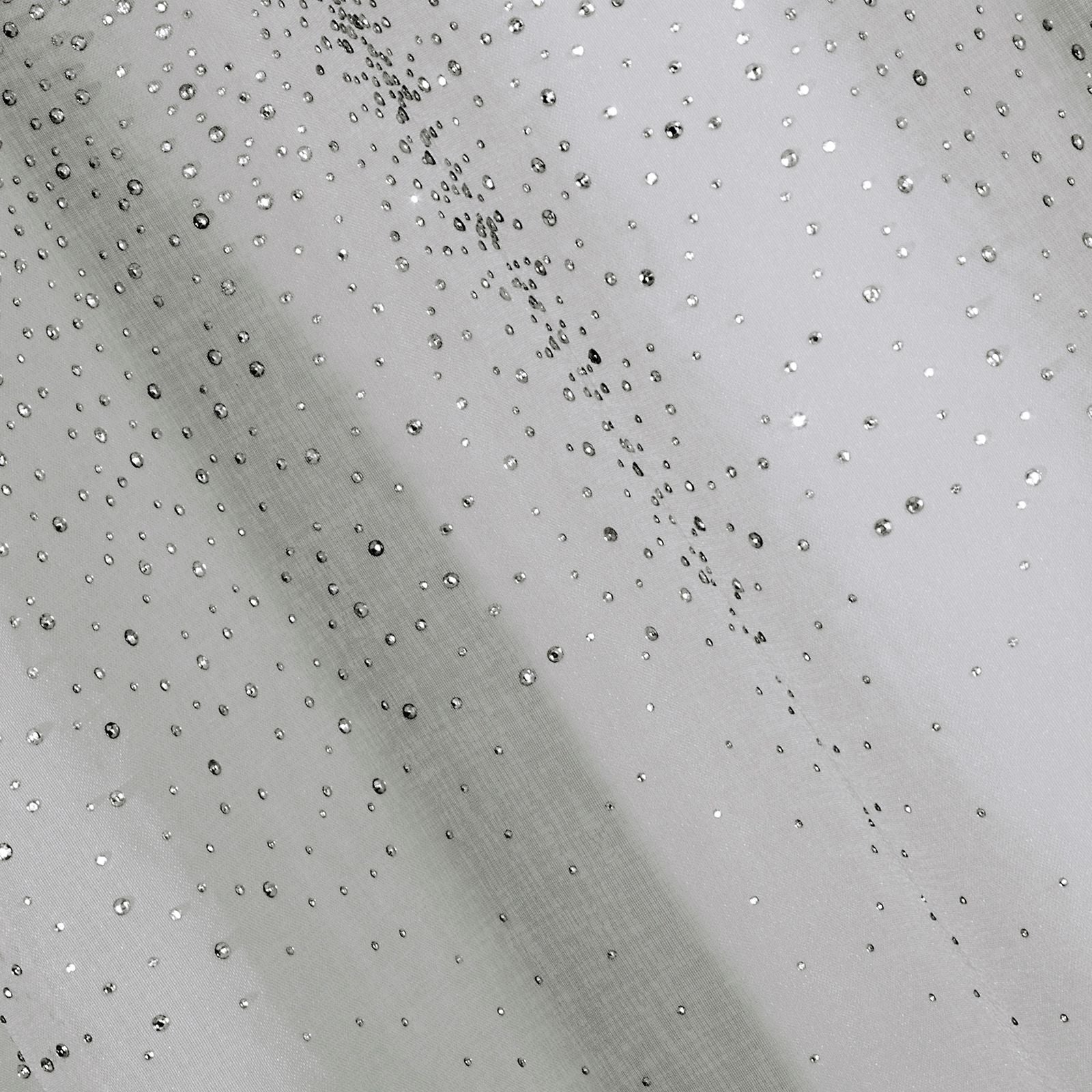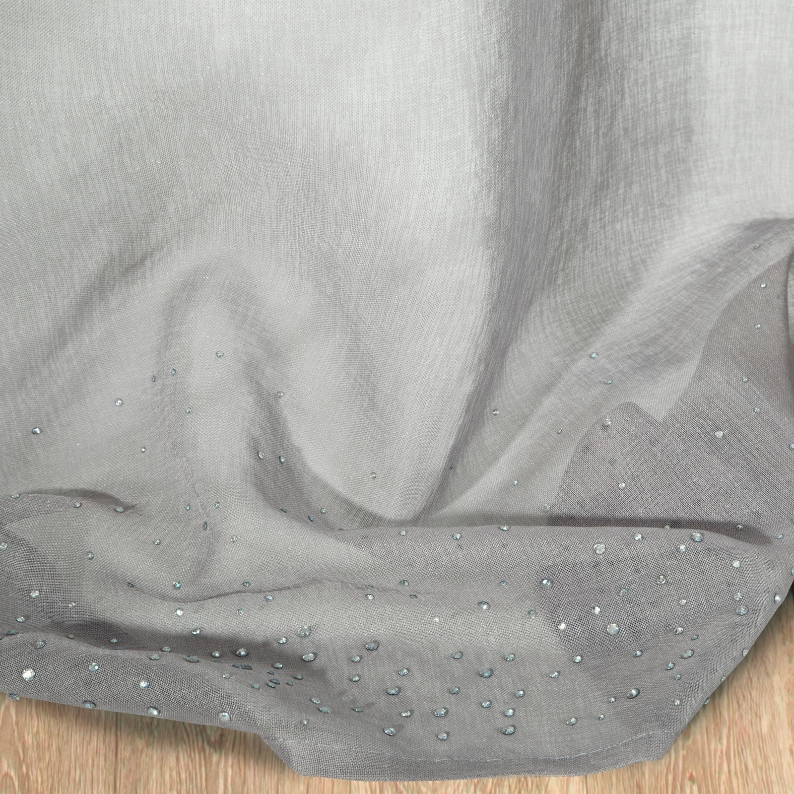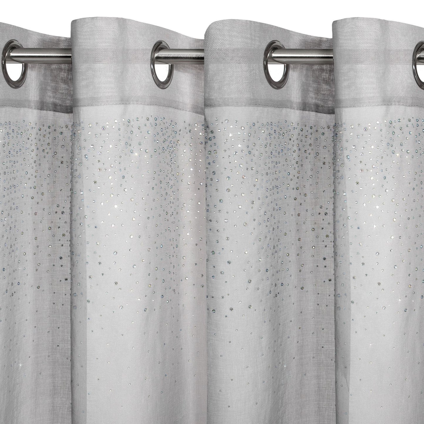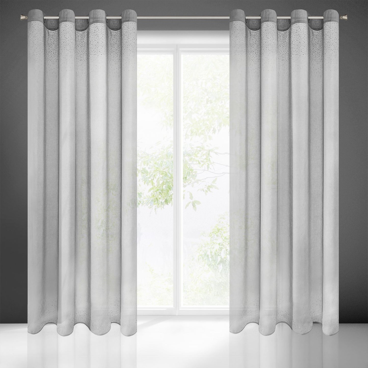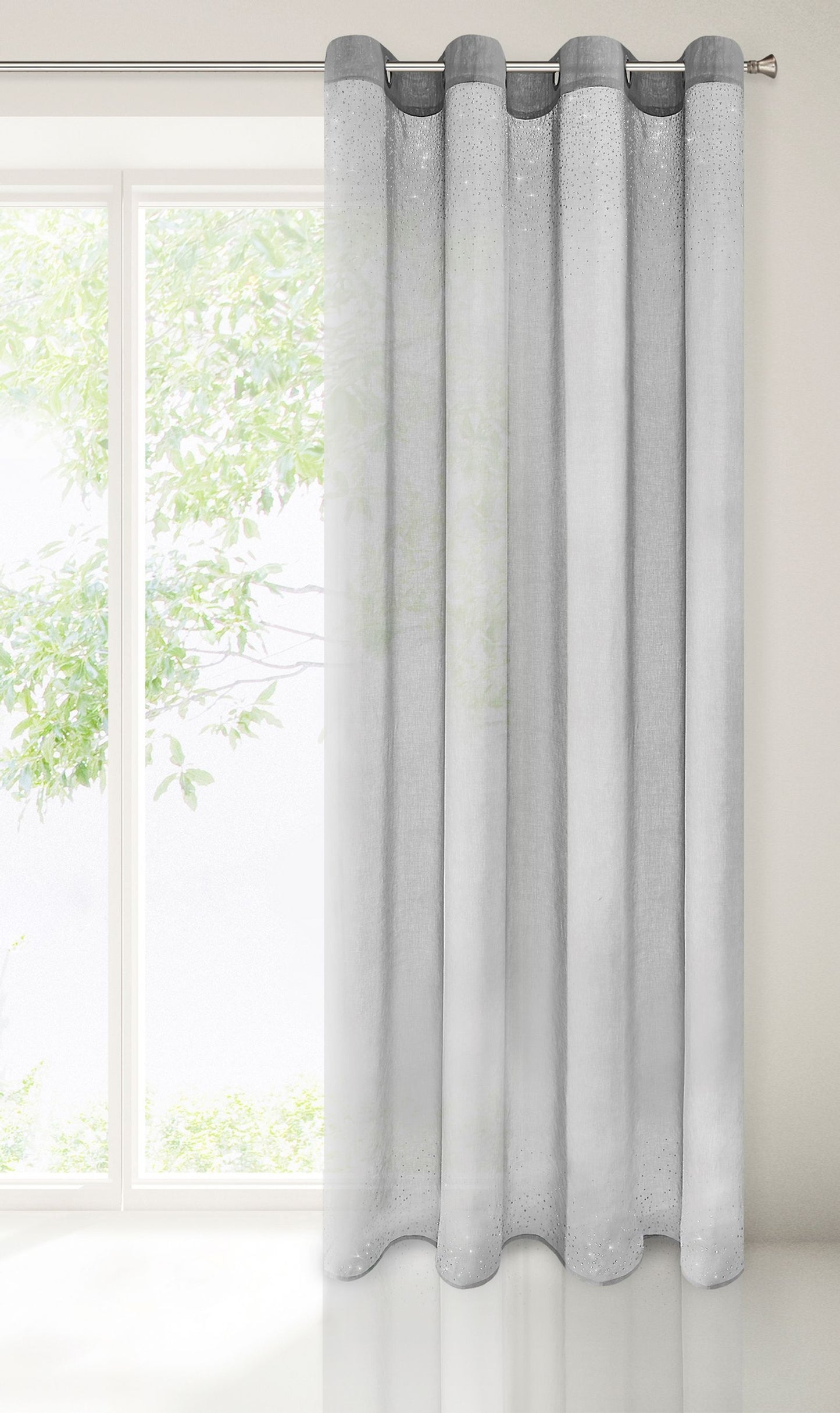 Delikāts sudraba aizkars ar modernu glamūra raksturu. Mīksts, viegls audums, kas augšējā daļā rotāts ar rhinestones joslu. Ļoti gaisīgs. platums: 140 cm, garums: 250 cm, krāsa: pelēka, svars: 70 GSM, sastāvs: Sastāvs: 100% poliesteris.