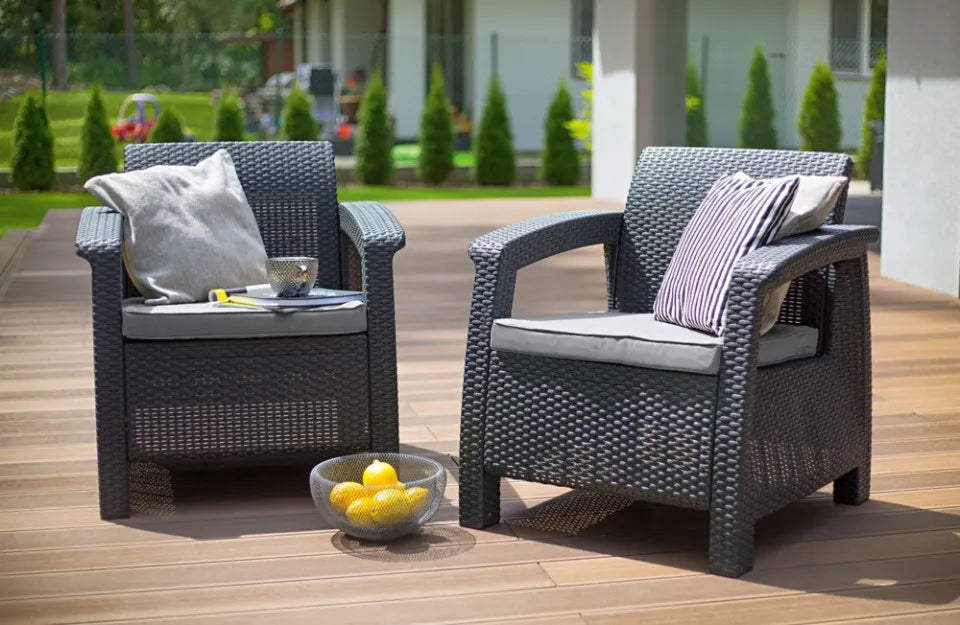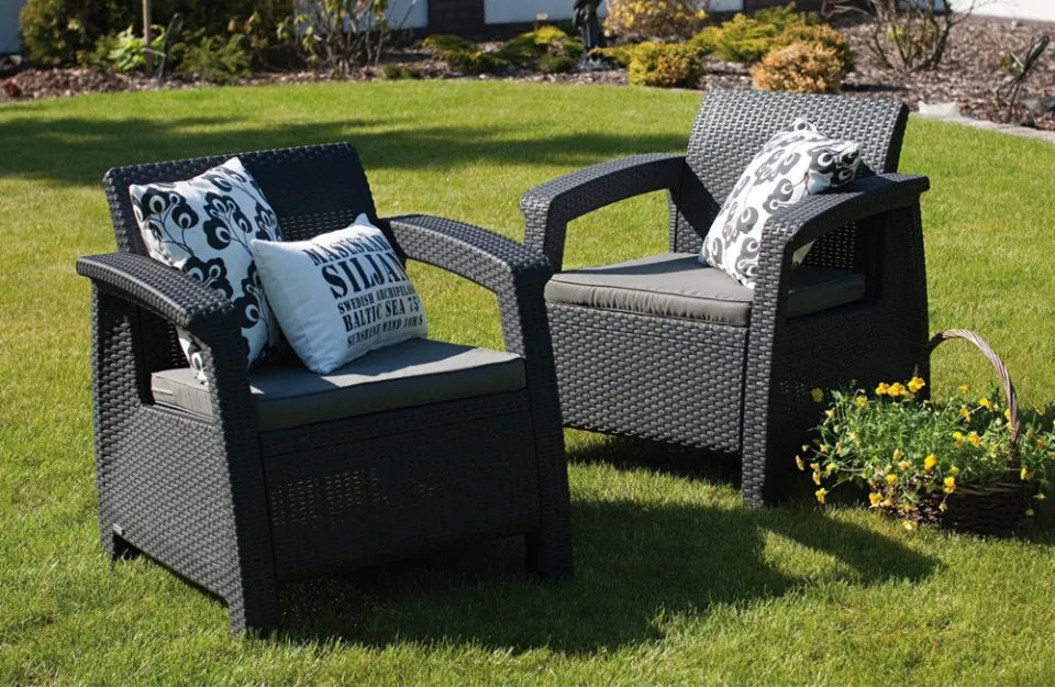 Komplektā ietilpst 2 ērti atpūtas krēsli ar spilvenu.