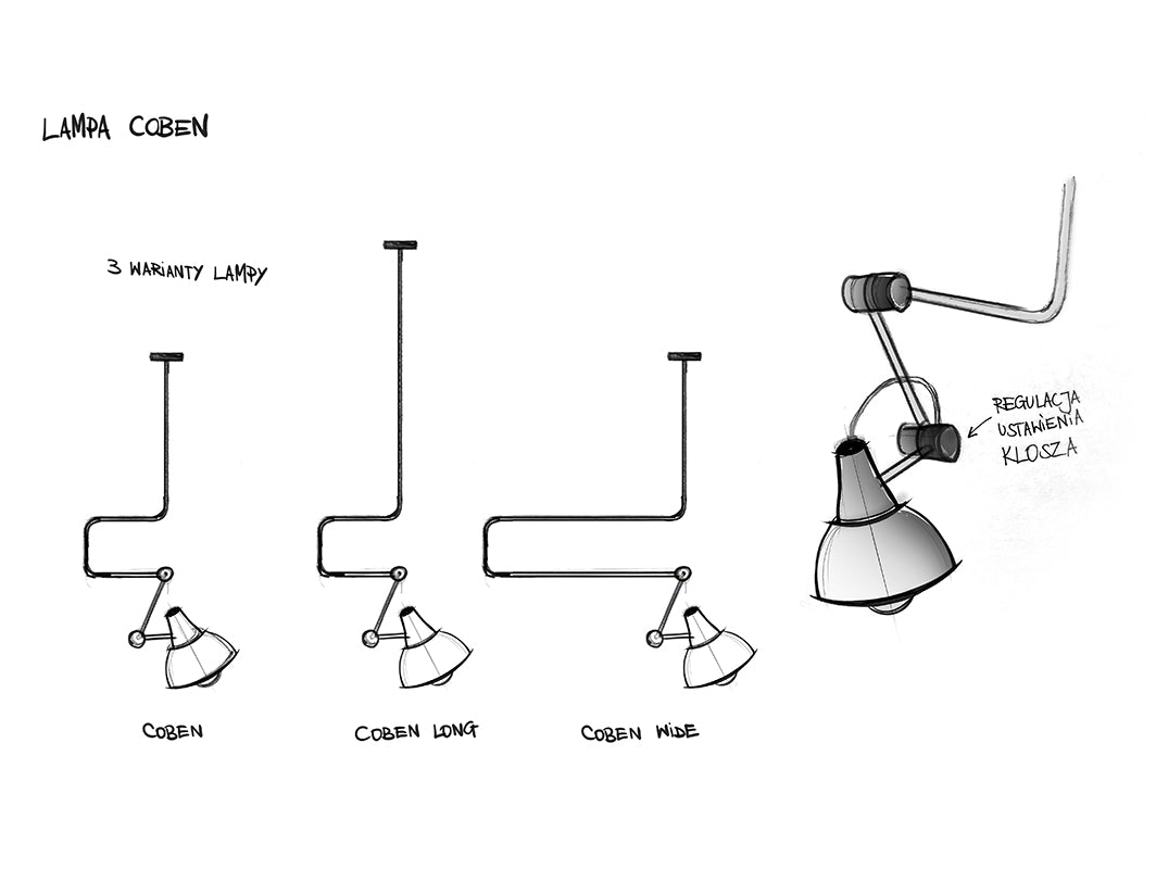 Coben lampu saimē ietilpst sienas lampa un piekaramā lampa. Coben lampa noteikti ir neparasta. Tās drosmīgais un netradicionālais dizains, lai gan šķiet iegremdēts tradicionālajā lampu plūsmā, ir savā ziņā revolucionārs un piesaista ikviena izcila dizaina cienītāja uzmanību. Protams, dizainers nav aizmirsis arī par funkcionālo lampu īpašībām. Plašais regulēšanas diapazons neapšaubāmi ir priekšrocība, kurai ir vērts pievērst uzmanību, meklējot piemērotu lampu mūsu dzīvoklim. Lietošana: Coben lampa ir nepieciešama visiem interjeru īpašniekiem, kas iekārtoti vai atsaucas uz minimālisma un industriālo stilu. Lampai vajadzētu ieinteresēt arī tos, kuri novērtē ikvienu eklektikas veidu un meklē ievērojamu priekšmetu, ar ko rotāt sava dzīvokļa sienas. Lampa ir piemērota arī telpām, kas raksturīgas sabiedriskajām telpām, piemēram, darbavietām - arhitektūras studijām, birojiem, reklāmas aģentūrām u. c. Patiesībā pielietojumu skaits ir atkarīgs no mūsu radošuma un iztēles.