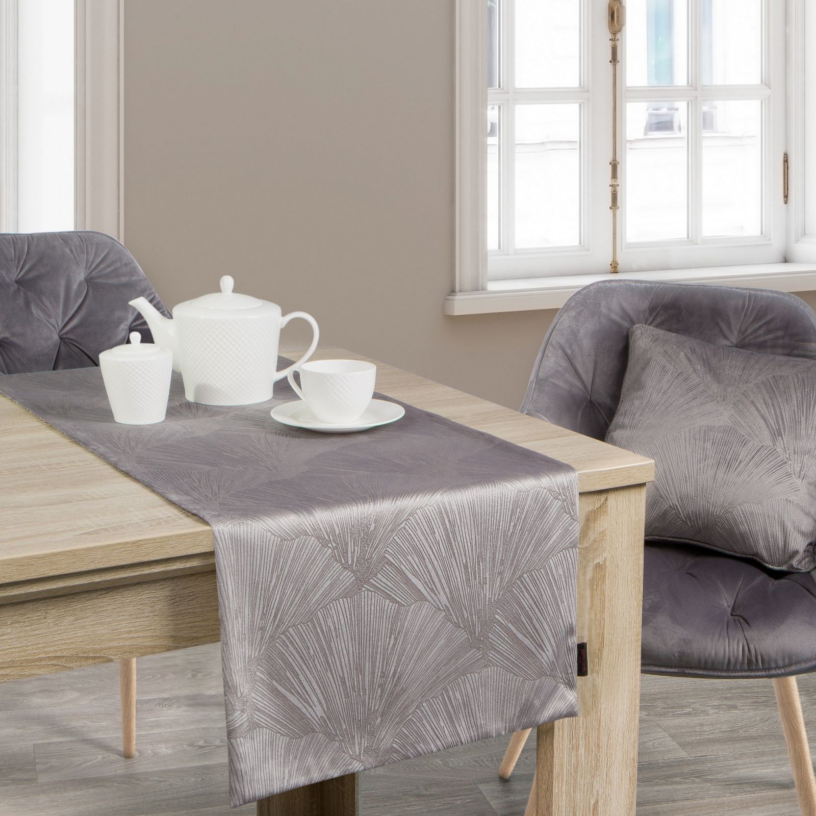 Samta galda klājs no Pierre Cardin kolekcijas ar spīdīgu apdruku platums: 40 cm, garums: 140 cm, krāsa: pelēka, svars: 200GSM GSM, sastāvs: Sastāvs: 100% poliesteris.