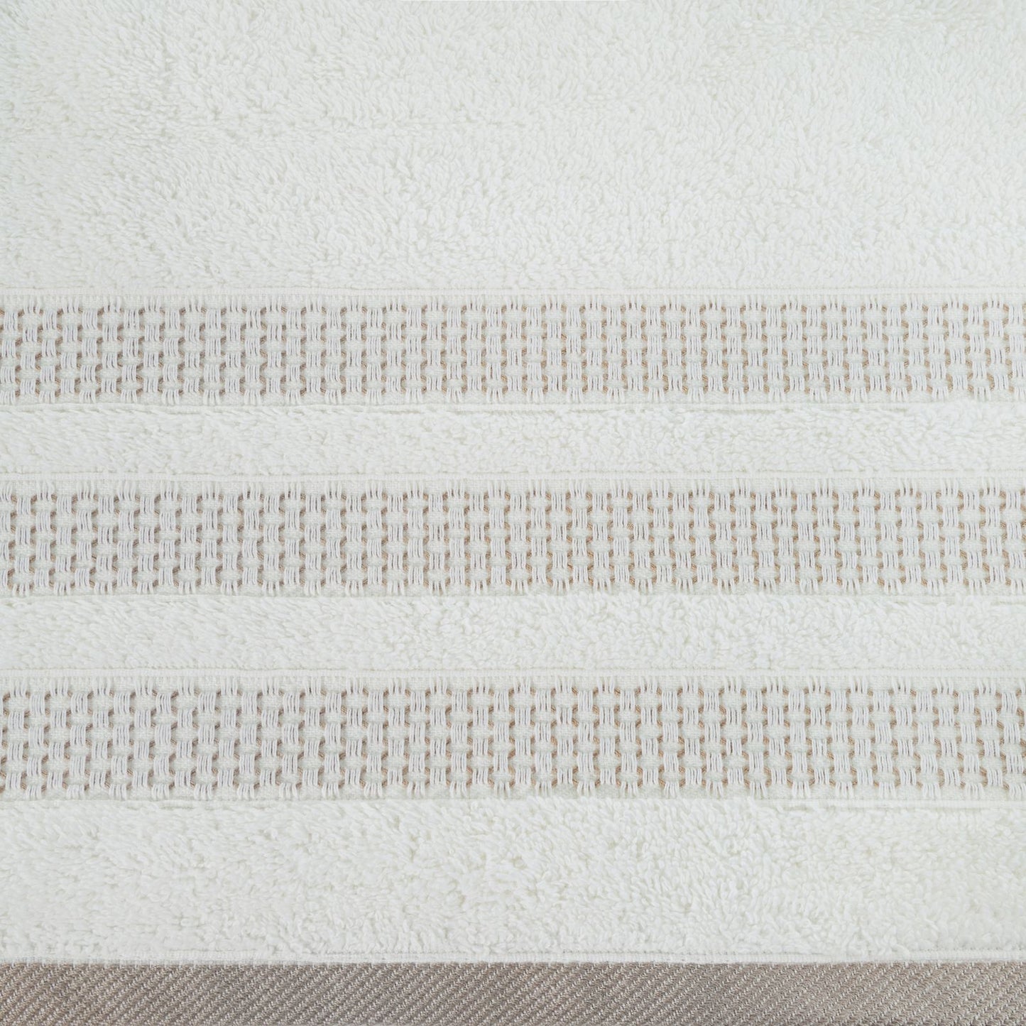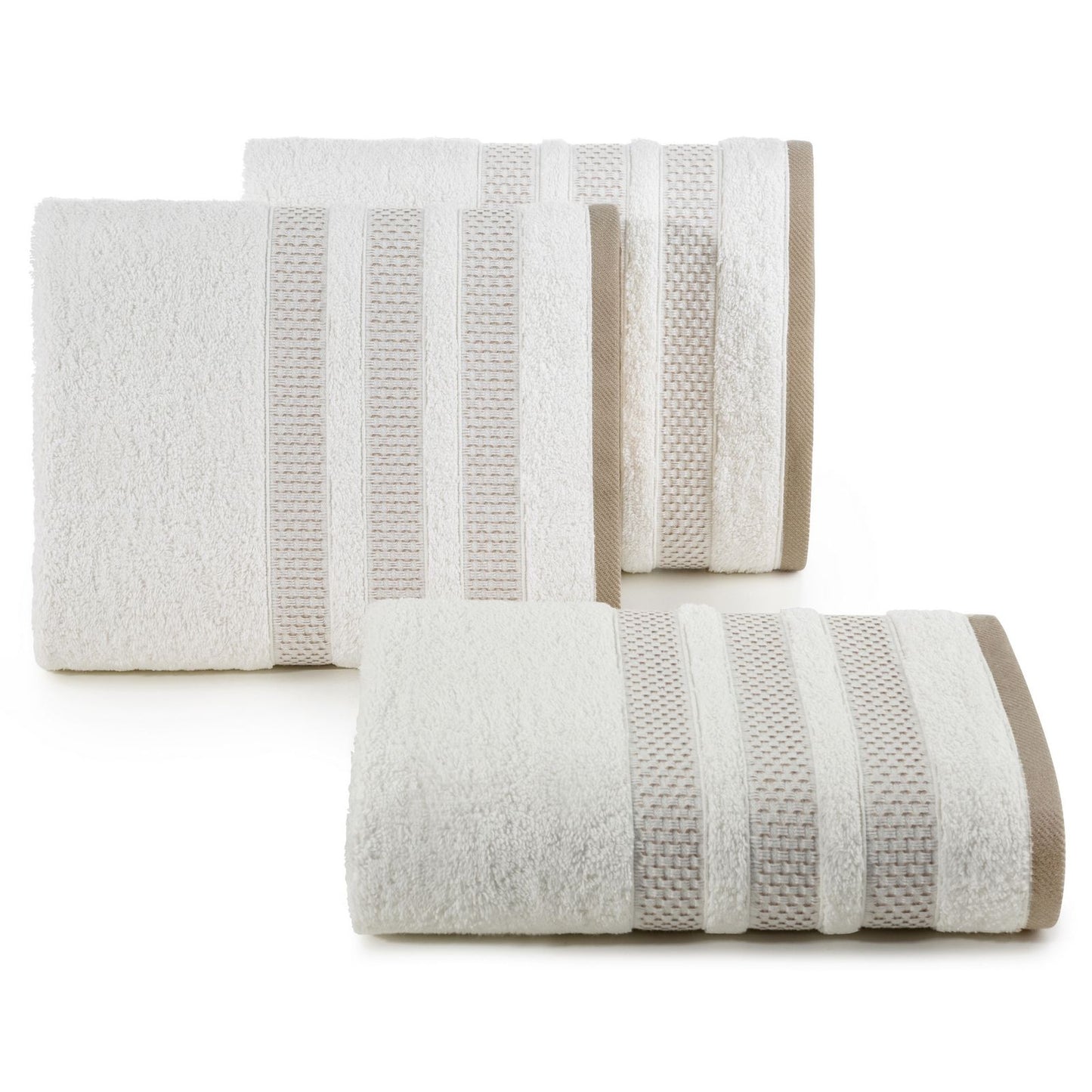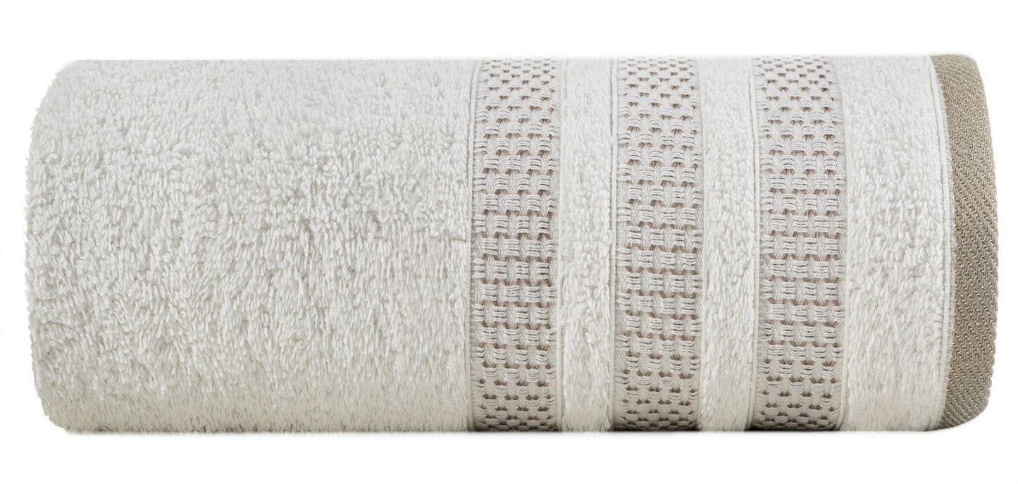 Dvieļu ar dekoratīvu svītrainu malu platums: 70 cm, garums: 140 cm, krāsa: krēma, svars: 500 GSM, sastāvs: Sastāvs: 100% kokvilna; 96,5% kokvilna, 3,5% poliesters.