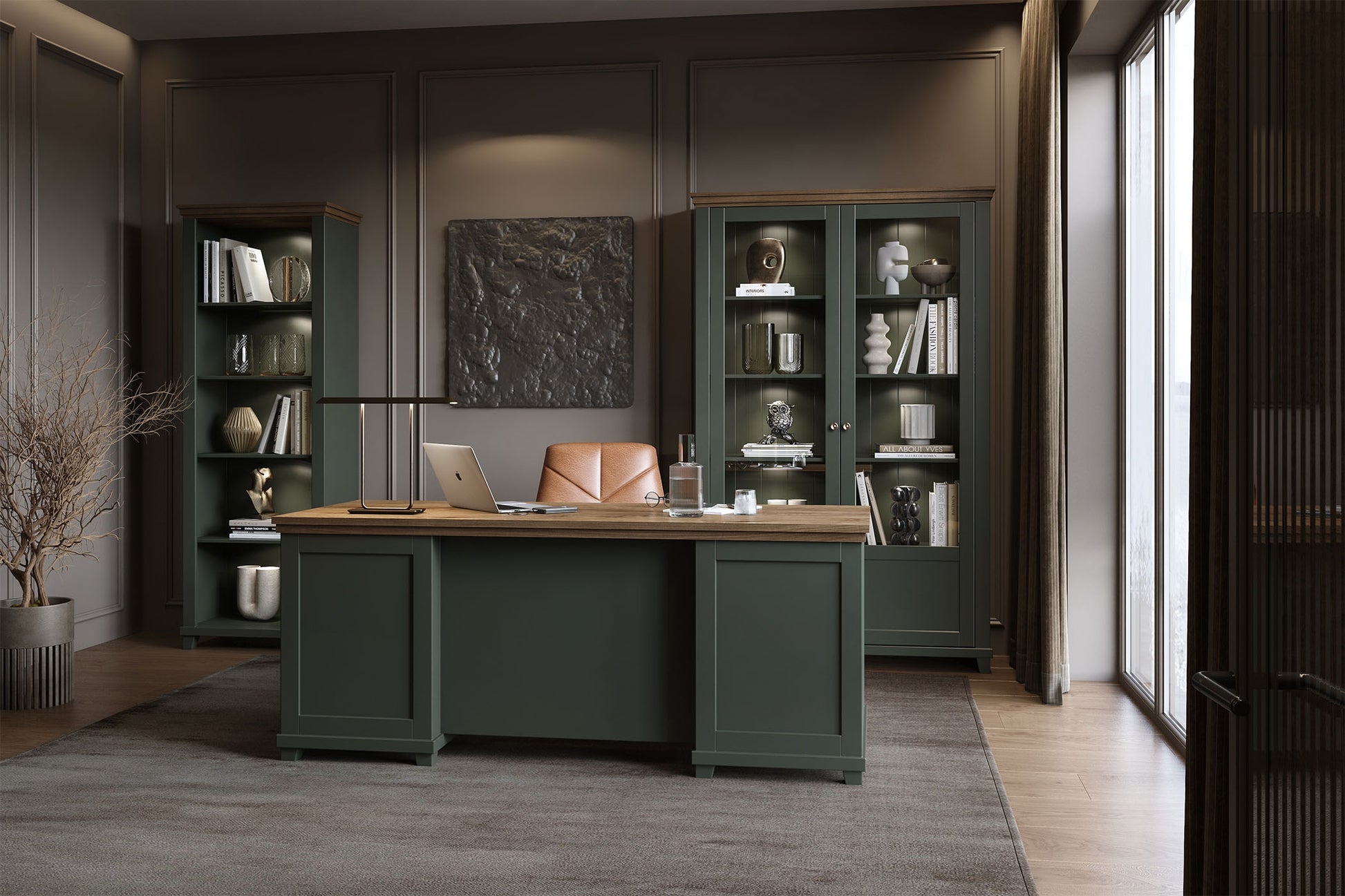 Tumši zaļa krāsa apvienojumā ar koku, vai kašmirs kombinācijā ar ozolu, ir piedāvājums elegances cienītājiem.