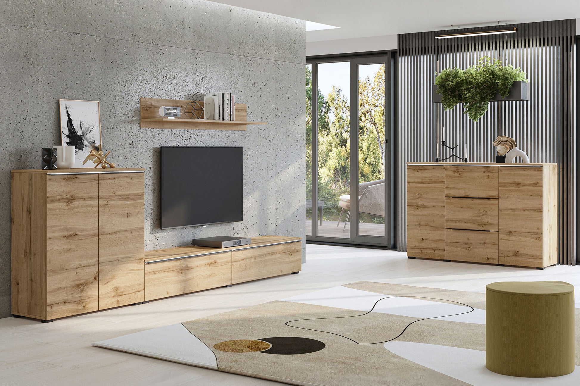 Tanos sienas skapis ir īsts multivides centrs, kas pārdomāti un funkcionāli organizē dzīvojamās istabas telpu.