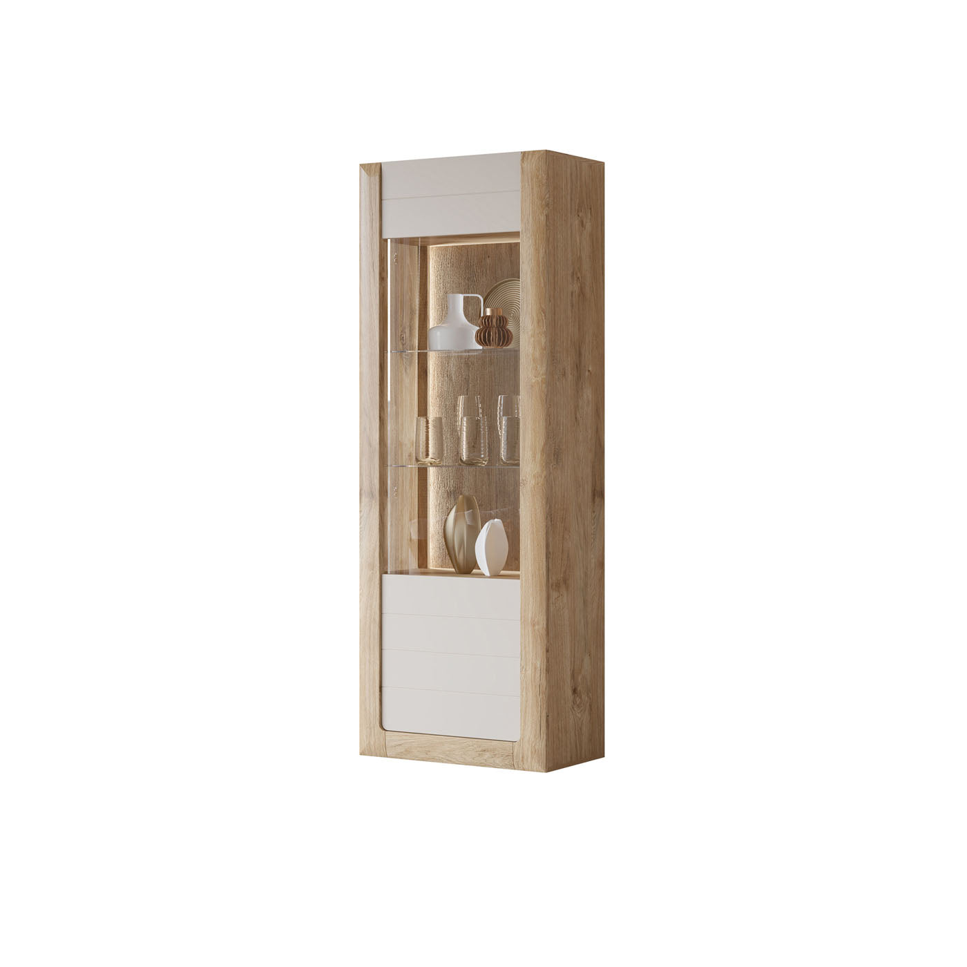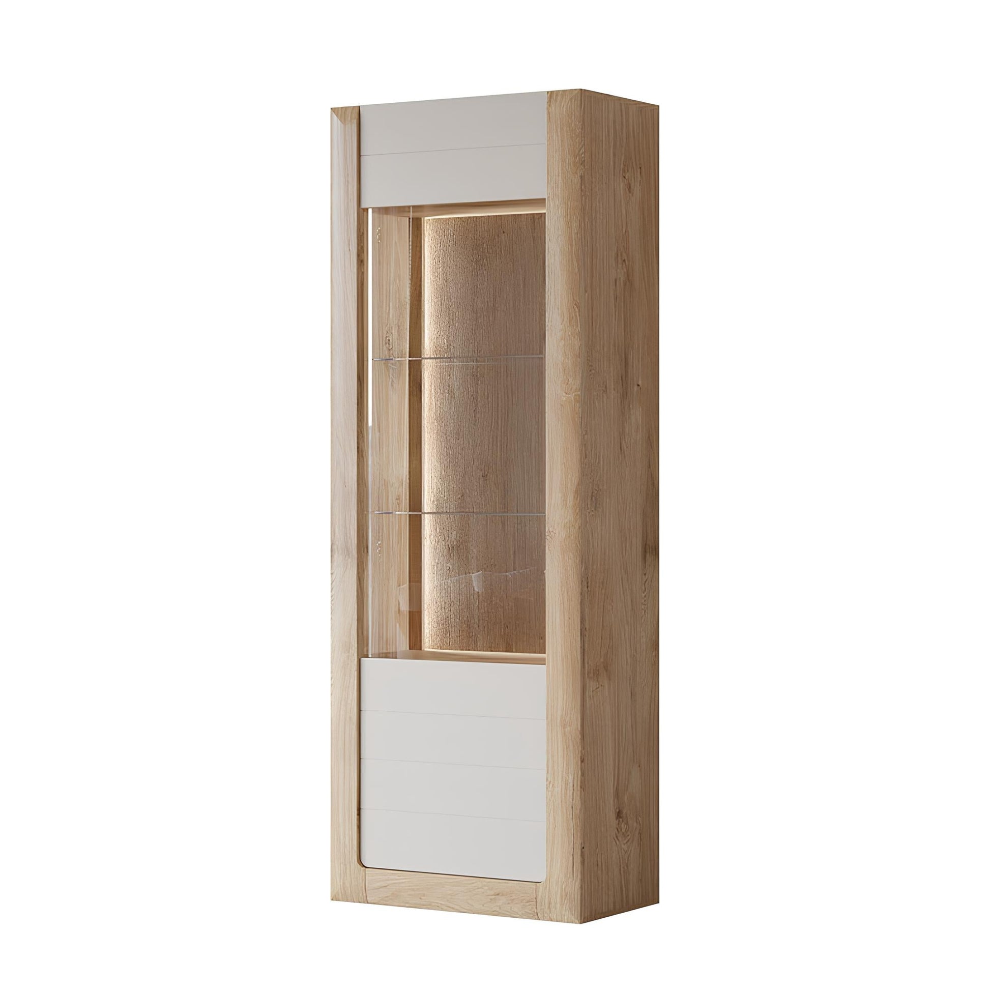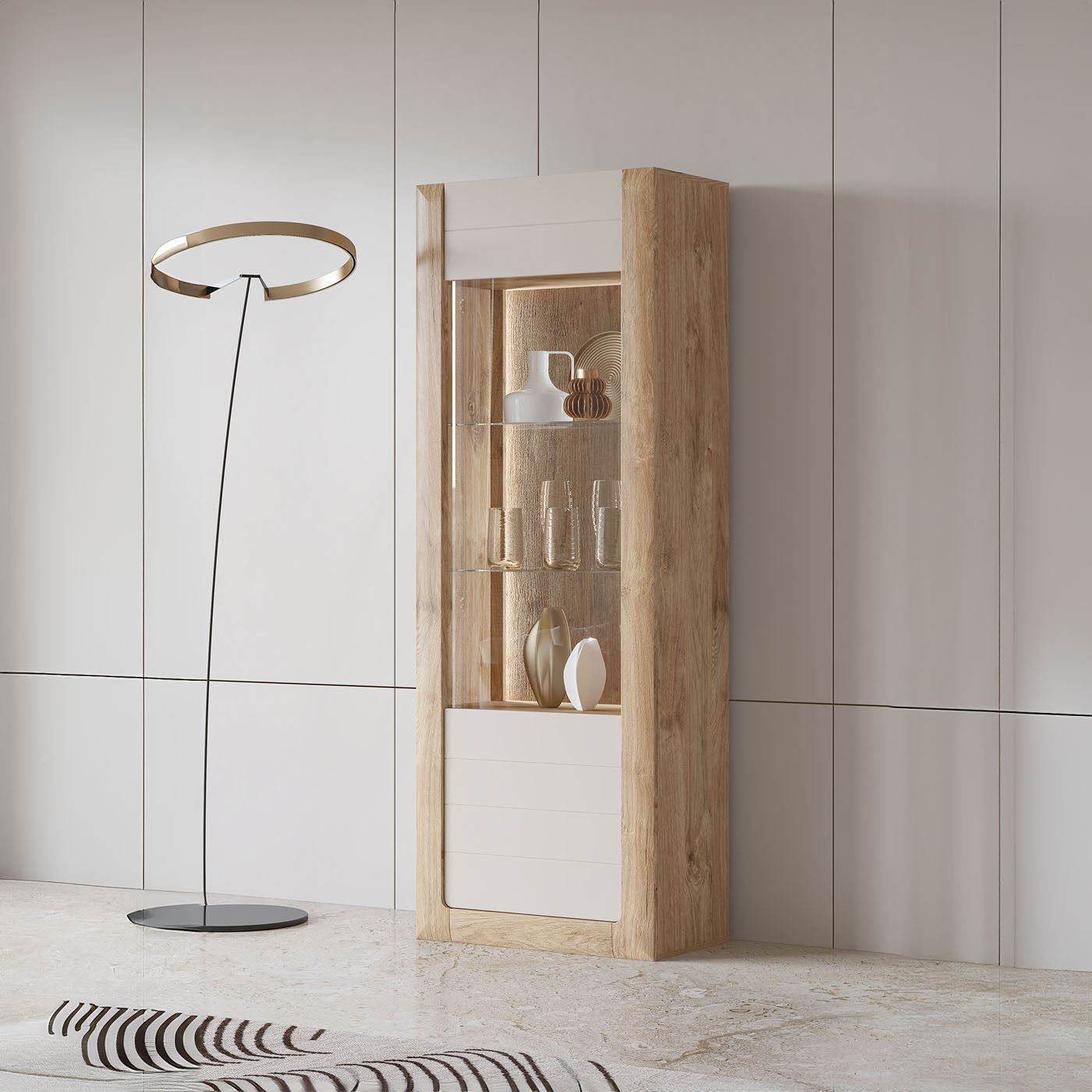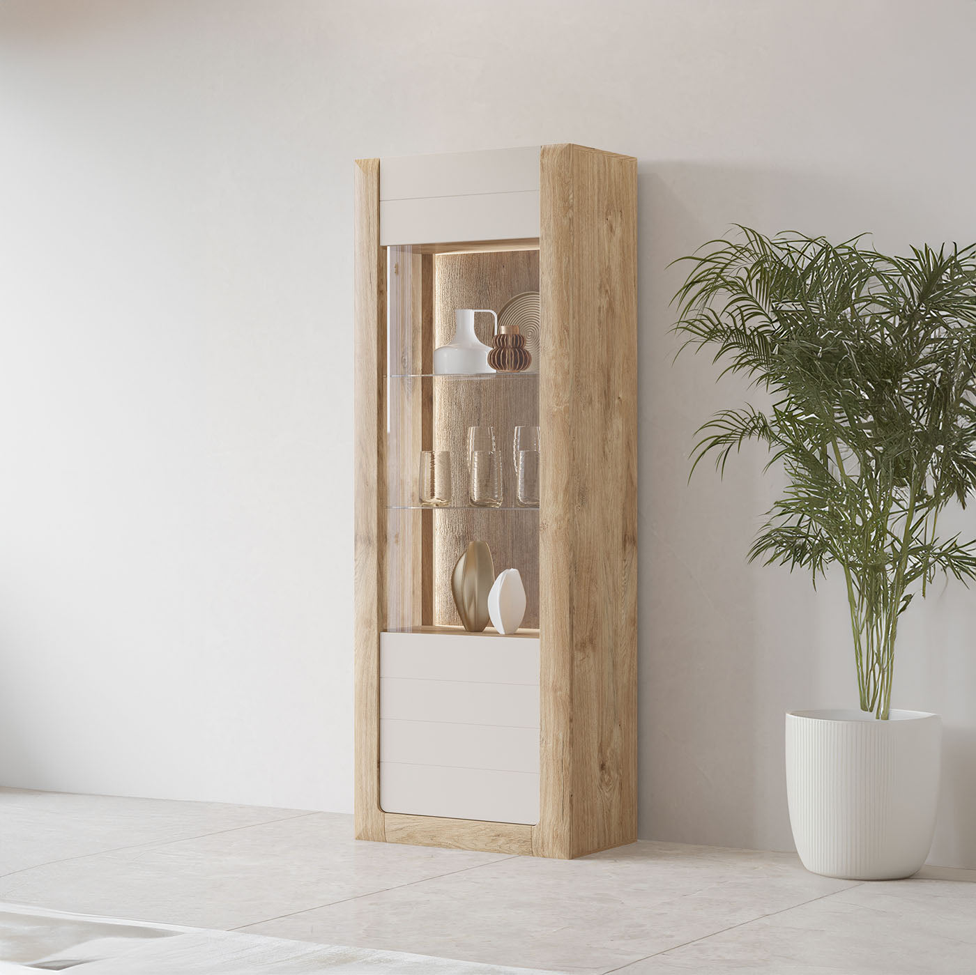 Vitrīnu skapīšu durvis ir izgatavotas no rūdīta stikla, piešķirot elegantu, modernu pieskārienu, vienlaikus uzlabojot mēbeļu drošību un izturību.
